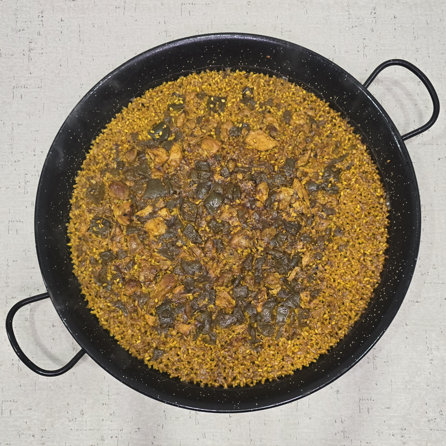 Con el sofrito especial de la abuela, contramuslos deshuesados de pollo y pimientos verdes.